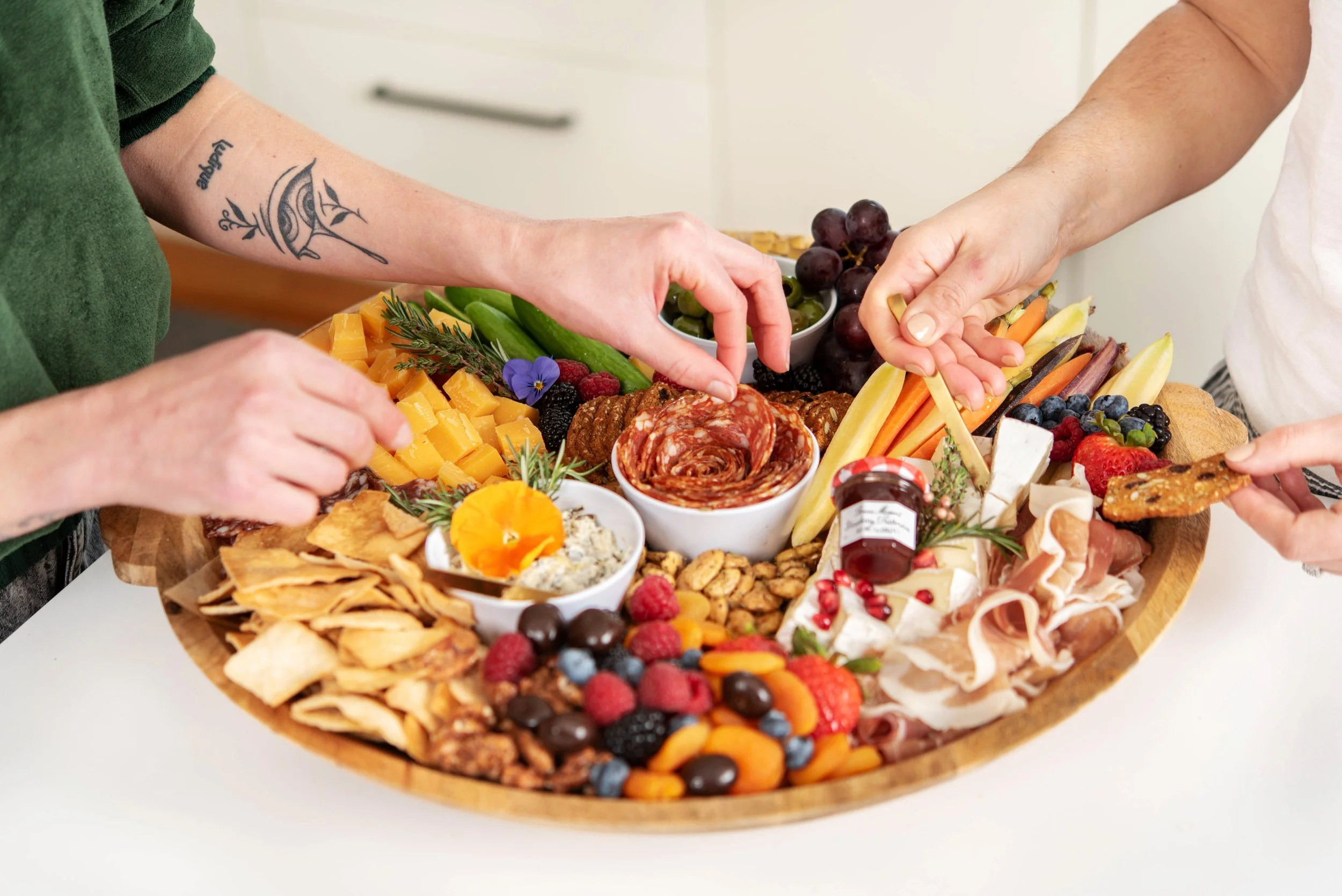 Each guest receives a charcuterie kit with a tray, workshop notes, and a 1-hour-long class instructed by Sprig & Spread owner/founder, Michele Fordice. We will share all of our tips & tricks to create a stunning charcuterie board and teach guests to build their own charcuterie board that expresses their own unique design style.